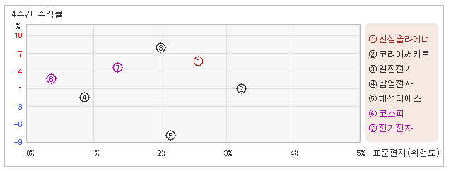 | 위험대비 수익률 2.1로 상위권, 업종지수보다 낮아 7일 오전 10시50분 현재 전일대비 4.14% 오른 2,390원을 기록하고 있는 신성솔라에너지는 지난 1개월간 5.51% 상승했다. 같은 기간동안에 위험를 나타내는 지표인 표준편차는 2.6%를 기록했다. 이는 전기전자 업종내에서 주요종목들과 비교해볼 때 신성솔라에너지의 월간 주가수익률이 상당히 높았던 만큼 변동성도 다소 높은 수준을 유지했다는 뜻이다. 최근 1개월을 기준으로 신성솔라에너지의 위험을 고려한 수익률은 2.1을 기록했는데, 변동성은 높았으나 주가흐름이 괜찮았기 때문에 위험대비 수익률은 높은 수준을 유지했다. 다만 전기전자업종의 위험대비수익률 3.1보다는 낮았기 때문에 업종대비 성과는 뛰어났다고 할 수 없다. 다음으로 업종과 시장을 비교해보면 신성솔라에너지가 속해 있는 전기전자업종은 코스피지수보다 변동성과 수익률이 모두 높은 모습이다. 다시 말하면 동업종에 탄력이 붙으면서 지수대비 초과상승했다는 의미이다. |