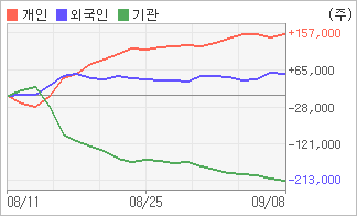 | 외국인/개인 순매수, 기관은 순매도(한달누적) 8월31일부터 전일까지 기관이 7거래일 연속 동종목을 내다 팔았다. 4주간을 기준으로 보면 외국인이 초반에 동종목을 순매수한 이후에 기세를 이어가며 56,363주를 순매수했고, 개인들도 순매수량을 늘리며 155,855주를 순매수했다. 하지만 기관은 매도 관점으로 접근하면서 212,218주를 순매도했다. |