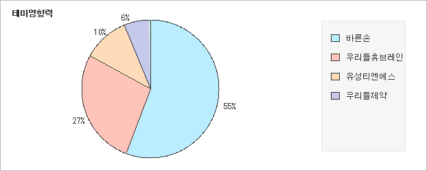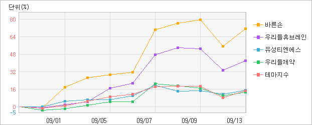 전체적인 평가에서는 바른손이 높은 순위를 차지했다. 최근 10거래일(2주)을 분석했을때, 바른손(70.92%), 우리들휴브레인(41.83%)의 상승률이 상대적으로 큰 것으로 나타났다. 위험도 분석에서는 바른손(0.84), 우리들휴브레인(0.78), 유성티엔에스(0.75)가 상대적으로 안정적인 수익을 올린 것으로 평가되고 변동성 대비 등락률을 구해보면 바른손(6.06), 우리들휴브레인(4.69), 유성티엔에스(3.92)가 좋은 모습을 보였다.
