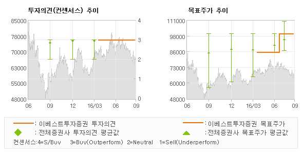 오늘 이베스트투자증권에서 발표된 '매수(유지)'의견 및 목표주가 100,000원은 전체의견에 수렴하면서 시장의 평균적인 기대감이 비교적 객관적으로 표현된 것으로 풀이되며 목표가평균 대비 3.2% 초과하고 있는 것으로 집계되었다. 참고로 최근에 목표주가를 가장 공격적으로 제시한 미래에셋대우에서 투자의견 '매수(유지)'에 목표주가 110,000원을 제일 보수적인 의견을 제시한 신한금융투자에서 투자의견 '매수(유지)'에 목표주가 86,000원을 제시한 바 있다.