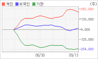 | 외국인/개인 순매수, 기관은 순매도(한달누적) 9월12일부터 전일까지 외국인이 2거래일 연속 순매수를 보였다. 4주간을 기준으로 보면 외국인이 매수 우위를 유지하면서 18,942주를 순매수했고, 개인들도 순매수량을 늘리며 227,328주를 순매수했다. 하지만 기관은 매도 관점으로 접근하면서 246,270주를 순매도했다. |