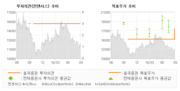 오늘 흥국증권에서 발표된 '매수(유지)'의견 및 목표주가 17,000원은 전체의견에 수렴하면서 시장의 평균적인 기대감이 비교적 객관적으로 표현된 것으로 풀이되며 목표가평균과 대비해서 미미한 차이가 나는 것으로 집계되었다. 참고로 최근에 목표주가를 가장 공격적으로 제시한 하이투자증권에서 투자의견 '매수(유지)'에 목표주가 19,000원을 제일 보수적인 의견을 제시한 IBK투자증권에서 투자의견 '매수(유지)'에 목표주가 16,000원을 제시한 바 있다.