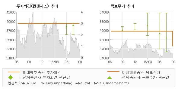 오늘 미래에셋증권에서 발표된 '매수'의견 및 목표주가 38,000원은 전체의견에 수렴하면서 시장의 평균적인 기대감이 비교적 객관적으로 표현된 것으로 풀이되며 목표가평균 대비 14%정도 미달하고 있는 것으로 집계되었다. 참고로 최근에 목표주가를 가장 공격적으로 제시한 한국투자증권에서 투자의견 '매수(유지)'에 목표주가 60,000원을 제일 보수적인 의견을 제시한 한화투자증권에서 투자의견 'HOLD(신규)'에 목표주가 34,000원을 제시한 바 있다.