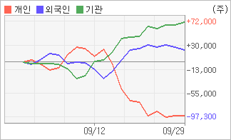 | 외국인/기관 순매수, 개인은 순매도(한달누적) 9월28일부터 전일까지 외국인이 2거래일 연속 순매도했다. 4주간을 기준으로 보면 외국인이 매매관점을 매도에서 매수로 전환하면서 21,974주를 순매수했고, 기관도 방향성있는 매매를 하면서 71,954주를 순매수했다. 반면 개인들은 매도 우위로 반전되면서 93,928주를 순매도한 것으로 나타났다. |