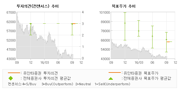 오늘 유안타증권에서 발표된 '매수(신규)'의견 및 목표주가 63,000원은 전체 컨센서스 대비해서 대체적으로 평균치에 해당하는 수준으로, 이번 의견은 동종목에 대한 전체적인 흐름에서 크게 벗어나지 않은 것으로 파악되며 목표가평균과 대비해서 미미한 차이가 나는 것으로 집계되었다. 참고로 최근에 목표주가를 가장 공격적으로 제시한 신영증권에서 투자의견 '매수'에 목표주가 75,000원을 제일 보수적인 의견을 제시한 흥국증권에서 투자의견 'HOLD(유지)'에 목표주가 50,000원을 제시한 바 있다.