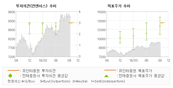 오늘 유안타증권에서 발표된 '매수(신규)'의견 및 목표주가 13,000원은 전체의견에 수렴하면서 시장의 평균적인 기대감이 비교적 객관적으로 표현된 것으로 풀이되며 목표가평균과 대비해서 미미한 차이가 나는 것으로 집계되었다. 참고로 최근에 목표주가를 가장 공격적으로 제시한 미래에셋증권에서 투자의견 '매수'에 목표주가 14,000원을 제일 보수적인 의견을 제시한 대신증권에서 투자의견 '매수(유지)'에 목표주가 12,000원을 제시한 바 있다.