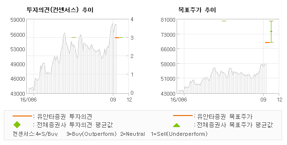 오늘 유안타증권에서 발표된 '매수(신규)'의견 및 목표주가 69,000원은 전체의견에 수렴하면서 시장의 평균적인 기대감이 비교적 객관적으로 표현된 것으로 풀이되며 목표가평균 대비 7.4%정도 미달하고 있는 것으로 집계되었다. 참고로 최근에 목표주가를 가장 공격적으로 제시한 현대증권에서 투자의견 '매수(유지)'에 목표주가 80,000원을 제시한 바 있다.
