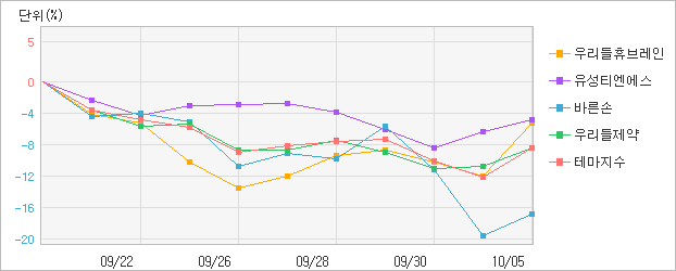 전체적인 평가에서는 우리들휴브레인이 높은 순위를 차지했다. 최근 10거래일(2주)을 분석했을때, 모든 종목 중 유성티엔에스(-4.8%)가 비교적 하락폭이 작은 모습을 나타냈다. 위험도 분석에서는 우리들휴브레인(0.42)이 상대적으로 높은 수치를 보였지만 전체종목이 안정적이지 못한 것으로 평가되고 있다.
