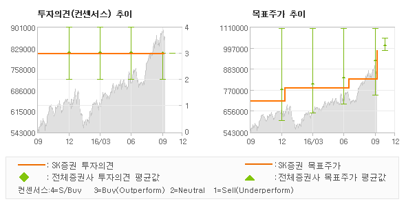 오늘 SK증권에서 발표된 '매수(유지)'의견 및 목표주가 980,000원은 전체 컨센서스 대비해서 대체적으로 평균치에 해당하는 수준으로, 이번 의견은 동종목에 대한 전체적인 흐름에서 크게 벗어나지 않은 것으로 파악되며 목표가평균과 대비해서 미미한 차이가 나는 것으로 집계되었다. 참고로 최근에 목표주가를 가장 공격적으로 제시한 이베스트투자증권에서 투자의견 '매수(유지)'에 목표주가 1,100,000원을 제일 보수적인 의견을 제시한 미래에셋증권에서 투자의견 '매수'에 목표주가 860,000원을 제시한 바 있다.