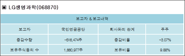 LG생명과학(068870)은 05일 주주 국민연금공단을 비롯한 특별관계자의 보유주식이 감소되었다고 발표했다. 이는 직전 보고일보다 516,474주 감소하여 지분율은 9.88%로 하락했다. 이번 보고 사유는 단순추가취득/처분으로 알려졌다.