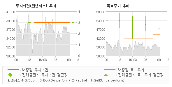 오늘 SK증권에서 발표된 '매수(유지)'의견 및 목표주가 44,000원은 전체의견에 수렴하면서 시장의 평균적인 기대감이 비교적 객관적으로 표현된 것으로 풀이되며 목표가평균 대비 7.9%정도 미달하고 있는 것으로 집계되었다. 참고로 최근에 목표주가를 가장 공격적으로 제시한 한화투자증권에서 투자의견 '매수(유지)'에 목표주가 54,000원을 제시한 바 있다.