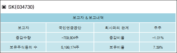 SK(034730)는 05일 주주 국민연금공단을 비롯한 특별관계자의 보유주식이 감소되었다고 발표했다. 이는 직전 보고일보다 709,804주 감소하여 지분율은 7.39%로 하락했다. 이번 보고 사유는 단순추가취득/처분으로 알려졌다.