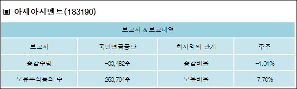 아세아시멘트(183190)는 05일 주주 국민연금공단을 비롯한 특별관계자의 보유주식이 감소되었다고 발표했다. 이는 직전 보고일보다 33,482주 감소하여 지분율은 7.7%로 하락했다. 이번 보고 사유는 단순추가취득/처분으로 알려졌다.