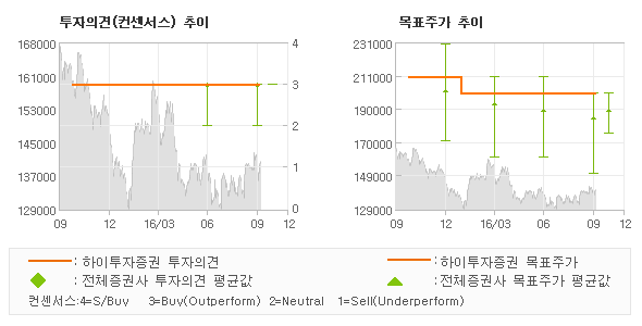 하이투자증권의 동종목에 대한 최근 1년동안의 투자의견은 전체적으로 큰 변화없이 유지되고 있다. 목표주가는 2015년10월 210,000원까지 높아졌다가 2016년1월 200,000원을 최저점으로 목표가가 제시된 이후 최근에도 200,000원으로 제시되고 있다.