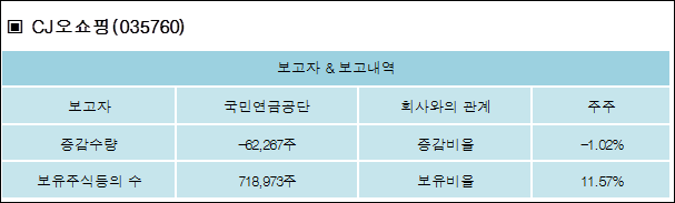 CJ오쇼핑(035760)은 05일 주주 국민연금공단을 비롯한 특별관계자의 보유주식이 감소되었다고 발표했다. 이는 직전 보고일보다 62,267주 감소하여 지분율은 11.57%로 하락했다. 이번 보고 사유는 단순추가취득/처분으로 알려졌다.