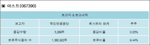 아스트(067390)는 05일 주주 국민연금공단을 비롯한 특별관계자의 보유주식이 증가되었다고 발표했다. 이는 직전 보고일보다 3,289주 증가하여 지분율은 9.44%로 상승했다. 이번 보고 사유는 단순추가취득/처분으로 알려졌다.