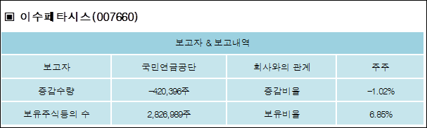 이수페타시스(007660)는 05일 주주 국민연금공단을 비롯한 특별관계자의 보유주식이 감소되었다고 발표했다. 이는 직전 보고일보다 420,396주 감소하여 지분율은 6.85%로 하락했다. 이번 보고 사유는 단순추가취득/처분으로 알려졌다.