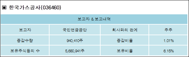한국가스공사(036460)는 05일 주주 국민연금공단을 비롯한 특별관계자의 보유주식이 증가되었다고 발표했다. 이는 직전 보고일보다 940,410주 증가하여 지분율은 6.15%로 상승했다. 이번 보고 사유는 단순추가취득/처분으로 알려졌다.