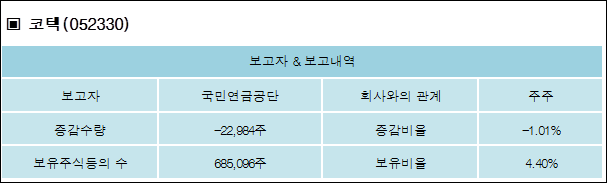 코텍(052330)은 05일 주주 국민연금공단을 비롯한 특별관계자의 보유주식이 감소되었다고 발표했다. 이는 직전 보고일보다 22,984주 감소하여 지분율은 4.4%로 하락했다. 이번 보고 사유는 단순추가취득/처분으로 알려졌다.