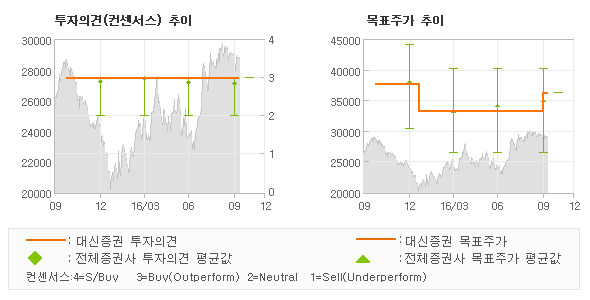 오늘 대신증권에서 발표된 '매수(유지)'의견 및 목표주가 36,000원은 전체의견에 수렴하면서 시장의 평균적인 기대감이 비교적 객관적으로 표현된 것으로 풀이되며 목표가평균과 대비해서 미미한 차이가 나는 것으로 집계되었다. 참고로 최근에 목표주가를 가장 공격적으로 제시한 한국투자증권에서 투자의견 '매수(유지)'에 목표주가 40,000원을 제일 보수적인 의견을 제시한 삼성증권에서 투자의견 '매수'에 목표주가 31,000원을 제시한 바 있다.