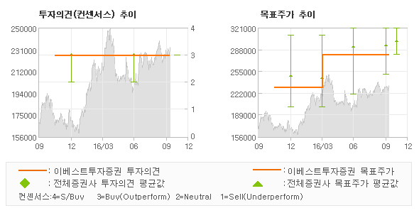 이베스트투자증권의 동종목에 대한 최근 1년동안의 투자의견은 전체적으로 큰 변화없이 유지되고 있다. 목표주가는 2015년11월 230,000원이 저점으로 제시된 이후 이번에 발표된 280,000원까지 꾸준하게 상향조정되어 왔다.