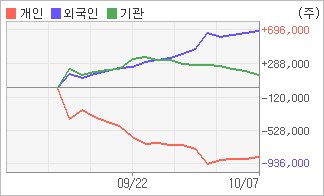 | 외국인/기관 순매수, 개인은 순매도(한달누적) 기관이 4일연속 주식을 팔고 있는 반면 외국인은 3일연속 주식을 사고 있다. 4주간을 기준으로 보면 외국인이 초반에 동종목을 순매수한 이후에 기세를 이어가며 695,187주를 순매수했고, 기관도 초반에 동종목을 순매수한 이후에 최근에는 순매수량이 줄어들고 있음에도 불구하고 153,773주를 순매수했다. 반면 개인들은 매도쪽으로 방향을 잡으면서 848,960주를 순매도한 것으로 나타났다. |