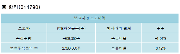 한라(014790)는 10일 주주 KTB자산운용(주)의 보유주식이 감소되었다고 발표했다. 이는 직전 보고일보다 808,359주 감소하여 지분율은 6.12%로 하락했다. 이번 보고 사유는 주식등의 수 변동에 따른 보유비율 1% 이상 변동으로 알려졌다.