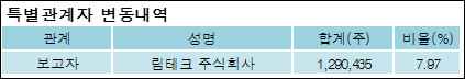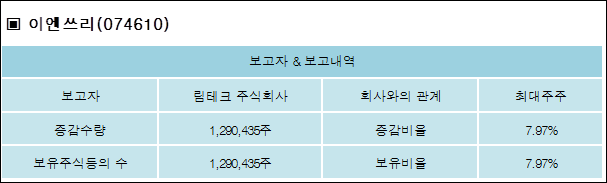 이엔쓰리(074610)는 10일 최대주주 림테크 주식회사의 보유주식이 증가되었다고 발표했다. 이는 직전 보고일보다 1,290,435주 증가하여 지분율은 7.97%로 상승했다. 이번 보고 사유는 주식 장외매매계약 취득으로 알려졌다.