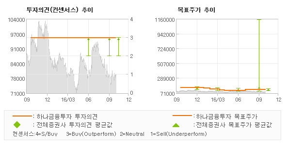 하나금융투자의 동종목에 대한 최근 1년동안의 투자의견은 전체적으로 큰 변화없이 유지되고 있다. 목표주가는 2015년10월 148,000원까지 높아졌다가 2016년4월 100,000원을 최저점으로 목표가가 제시된 이후 최근에 115,000원으로 새롭게 조정되고 있다.
