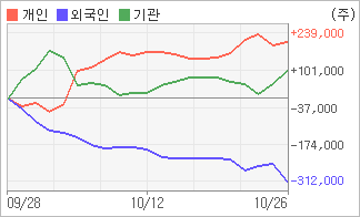 | 기관/개인 순매수, 외국인은 순매도(한달누적) 10월25일부터 전일까지 기관이 2거래일 연속 순매수했다. 4주간을 기준으로 보면 기관이 방향성있는 매매를 하면서 102,520주를 순매수했고, 개인들도 순매수량을 늘리며 209,363주를 순매수했다. 반면 그 동안 외국인은 매도 우위를 지속하면서 311,883주를 순매도했다. |