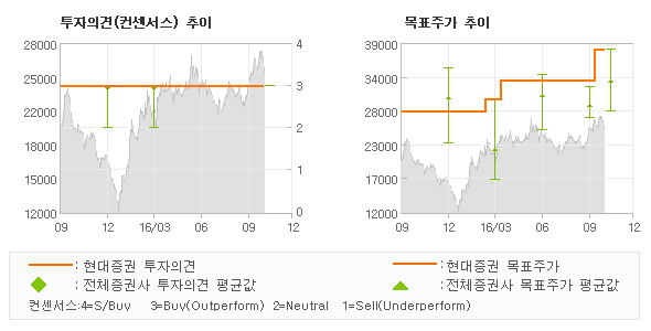 현대증권의 동종목에 대한 최근 1년동안의 투자의견은 전체적으로 큰 변화없이 유지되고 있다. 목표주가는 2015년10월 28,000원이 저점으로 제시된 이후 이번에 발표된 38,000원까지 꾸준하게 상향조정되어 왔다.