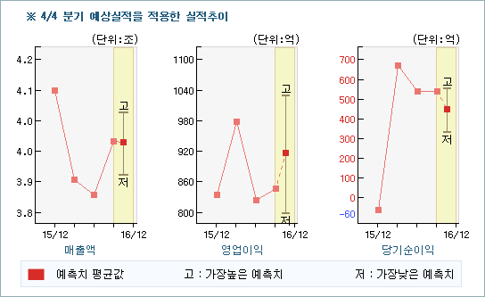 현대증권에서 내놓은 의견에 따르면 포스코대우의 4분기 예상실적은 매출액 4조0630억원으로 전년동기와 비교해서 -1.32%로 큰 변화가 없고, 영업이익은 1,030억원으로 23.62% 증가, 그리고 당기순이익은 560억원으로 -1133.21%정도의 감소가 예상되고 있다. 또한 이를 직전분기에 맞추어본다면 매출액은 5.9%증가, 영업이익 55.23%증가, 그리고 당기순이익은 198.44%가 증가할 것으로 예측된다.