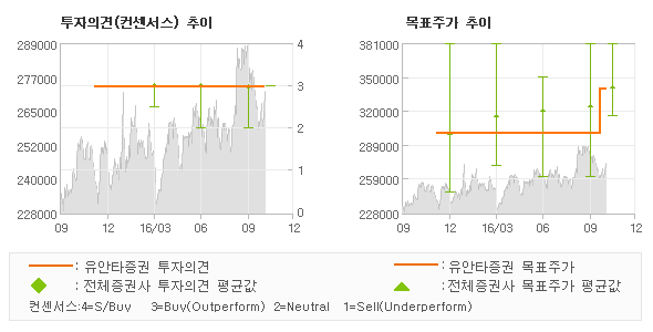 유안타증권의 동종목에 대한 최근 1년동안의 투자의견은 전체적으로 큰 변화없이 유지되고 있다. 목표주가는 2015년12월 300,000원이 저점으로 제시된 이후 이번에 발표된 340,000원까지 꾸준하게 상향조정되어 왔다.