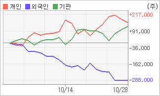 | 기관/개인 순매수, 외국인은 순매도(한달누적) 10월26일부터 전일까지 기관이 3거래일 연속 순매수했다. 4주간을 기준으로 보면 기관이 방향성있는 매매를 하면서 128,526주를 순매수했고, 개인들도 순매수량을 늘리며 158,883주를 순매수했다. 반면 그 동안 외국인은 매도 우위를 지속하면서 287,409주를 순매도했다. |