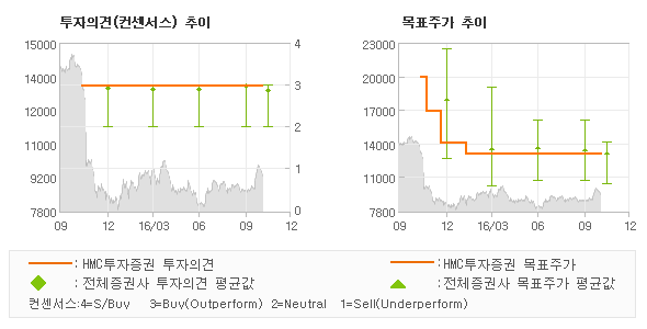 HMC투자증권의 동종목에 대한 최근 1년동안의 투자의견은 전체적으로 큰 변화없이 유지되고 있다. 목표주가는 2015년11월 20,000원까지 높아졌다가 2016년2월 13,000원을 최저점으로 목표가가 제시된 이후 최근에도 13,000원으로 제시되고 있다.