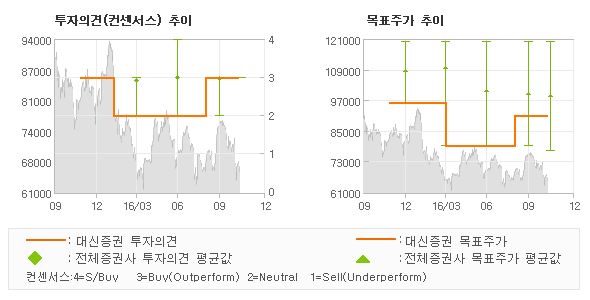 대신증권의 동종목에 대한 최근 1년동안의 투자의견은 전체적으로 큰 변화없이 유지되고 있다. 목표주가는 2015년11월 96,000원까지 높아졌다가 2016년3월 79,000원을 최저점으로 목표가가 제시된 이후 최근에 91,000원으로 새롭게 조정되고 있다.