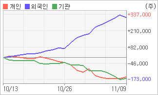 | 기관과 개인은 순매도, 외국인은 순매수(한달누적) 전일 기관이 9,962주를 순매수했고, 외국인은 20,187주를 순매도했다. 4주간을 기준으로 보면 외국인이 초반에 동종목을 순매수한 이후에 기세를 이어가며 315,849주를 순매수한 반면, 기관은 매도 관점으로 접근하면서 162,197주를 순매도했고, 개인들도 매도쪽으로 방향을 잡으면서 153,652주를 순매도한 것으로 집계됐다. |