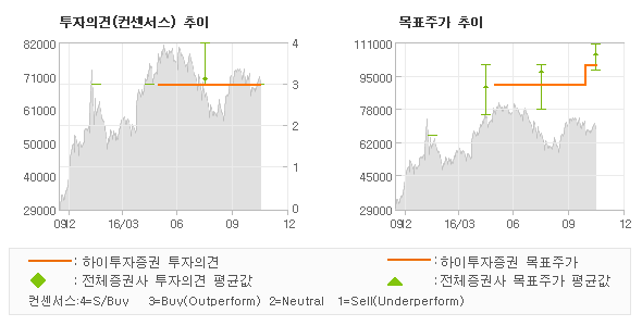 하이투자증권의 동종목에 대한 최근 6개월 동안의 투자의견은 전체적으로 큰 변화없이 유지되고 있다. 목표주가는 2016년5월 90,000원이 저점으로 제시된 이후 이번에 발표된 100,000원까지 꾸준하게 상향조정되어 왔다.