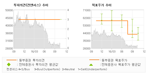 동부증권의 동종목에 대한 최근 1년동안의 투자의견은 전체적으로 큰 변화없이 유지되고 있다. 목표주가는 2015년11월 58,000원까지 높아졌다가 2016년8월 42,000원을 최저점으로 목표가가 제시된 이후 최근에도 42,000원으로 제시되고 있다.
