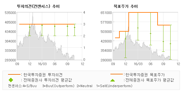 한국투자증권의 동종목에 대한 최근 1년동안의 투자의견은 전체적으로 큰 변화없이 유지되고 있다. 목표주가는 2015년10월 450,000원이 저점으로 제시된 이후 2016년1월 650,000원을 최고점으로 목표가가 제시되었고 최근에는 550,000원으로 다소 하향조정되고 있다.