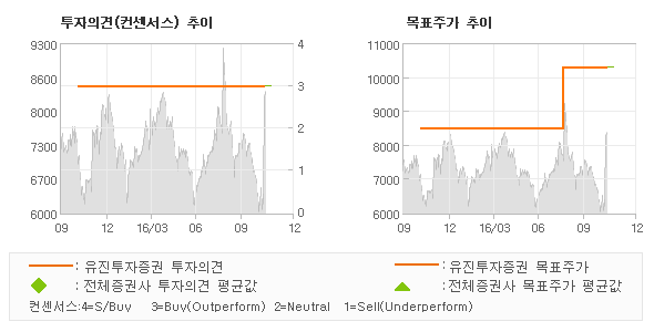 유진투자증권의 동종목에 대한 최근 1년동안의 투자의견은 전체적으로 큰 변화없이 유지되고 있다. 목표주가는 2015년11월 8,500원이 저점으로 제시된 이후 이번에 발표된 10,300원까지 꾸준하게 상향조정되어 왔다.