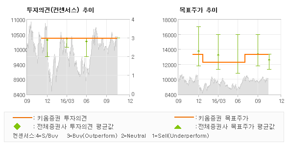 키움증권의 동종목에 대한 최근 1년동안의 투자의견은 전체적으로 큰 변화없이 유지되고 있다. 목표주가는 한때 2016년1월 12,500원을 저점으로 기록된 이후 최근에 13,500원까지 다시 상향조정되고 있다.