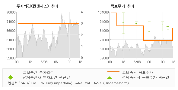 오늘 교보증권에서 발표된 '매수(유지)'의견 및 목표주가 83,000원은 전체의견에 수렴하면서 시장의 평균적인 기대감이 비교적 객관적으로 표현된 것으로 풀이되며 목표가평균과 대비해서 미미한 차이가 나는 것으로 집계되었다. 참고로 최근에 목표주가를 가장 공격적으로 제시한 유진투자증권에서 투자의견 '매수(유지)'에 목표주가 90,000원을 제일 보수적인 의견을 제시한 IBK투자증권에서 투자의견 '매수'에 목표주가 80,000원을 제시한 바 있다.