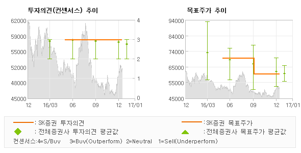 SK증권의 동종목에 대한 최근 6개월 동안의 투자의견은 전체적으로 큰 변화없이 유지되고 있다. 목표주가는 2016년5월 70,000원까지 높아졌다가 2016년10월 60,000원을 최저점으로 목표가가 제시된 이후 최근에도 60,000원으로 제시되고 있다.