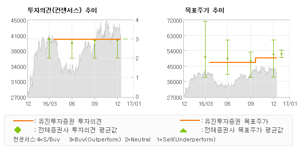 유진투자증권의 동종목에 대한 최근 6개월 동안의 투자의견은 전체적으로 큰 변화없이 유지되고 있다. 목표주가는 2016년4월 47,000원이 저점으로 제시된 이후 이번에 발표된 49,600원까지 꾸준하게 상향조정되어 왔다.