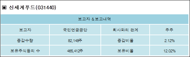 신세계푸드(031440)는 10일 주주 국민연금공단을 비롯한 특별관계자의 보유주식이 증가되었다고 발표했다. 이는 직전 보고일보다 82,148주 증가하여 지분율은 12.02%로 상승했다. 이번 보고 사유는 단순추가취득/처분으로 알려졌다.