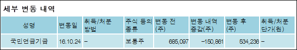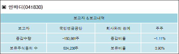 인바디(041830)는 10일 주주 국민연금공단을 비롯한 특별관계자의 보유주식이 감소되었다고 발표했다. 이는 직전 보고일보다 150,861주 감소하여 지분율은 3.9%로 하락했다. 이번 보고 사유는 단순추가취득/처분으로 알려졌다.