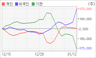 | 외국인/개인 순매수, 기관은 순매도(한달누적) 기관이 3일연속 주식을 팔고 있는 반면 외국인은 3일연속 주식을 사고 있다. 4주간을 기준으로 보면 외국인이 매매관점을 매도에서 매수로 전환하면서 369,192주를 순매수했고, 개인들도 매수반전의 모습을 보이며 4,918주를 순매수했다. 하지만 기관은 순매수에서 순매도로 반전되면서 374,110주를 순매도했다. |