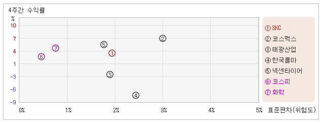 | 업종지수와 비교해서 변동폭 대비 수익률은 다소 부정적 13일 오후 1시40분 현재 전일대비 2.73% 하락하면서 32,100원을 기록하고 있는 SKC는 지난 1개월간 2.88% 상승했다. 같은 기간동안 위험를 나타내는 지표인 표준편차는 1.9%를 기록했다. 이는 코스피 업종내에서 주요종목들과 비교해볼 때 SKC의 월간 주가수익률과 변동성 모두 적정한 수준을 유지했다는 뜻이다. 최근 1개월을 기준으로 SKC의 위험을 고려한 수익률은 1.5를 기록했는데, 변동성과 주가상승률이 모두 적정 수준을 유지하면서 위험대비 수익률도 중간 수준을 나타냈다. 다만 코스피업종의 위험대비수익률 4.7보다는 낮았기 때문에 업종대비 성과는 긍정적으로 보기 어렵다. 다음으로 업종과 시장을 비교해보면 SKC가 속해 있는 코스피업종은 화학지수보다 변동성과 수익률이 모두 낮은 모습을 보여주고 있다. 다시 말해서 동업종의 탄력이 떨어지면서 업종상승률도 미진했다는 의미이다. |