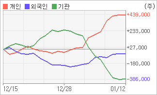| 외국인과 기관은 순매도, 개인은 순매수(한달누적) 전일 기관이 11,469주를 순매수했고, 외국인은 5,587주를 순매도했다. 4주간을 기준으로 보면 외국인이 매도 후 매수의 관점을 보이고 있음에도 불구하고 59,164주를 순매도했고, 기관도 순매수에서 순매도로 반전되면서 373,704주를 순매도했지만, 개인은 오히려 매수반전의 모습을 보이며 432,868주를 순매수했다. |
